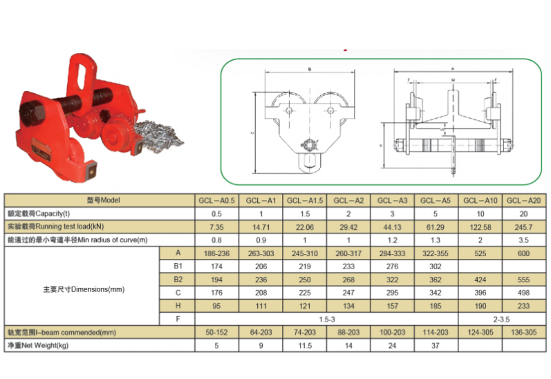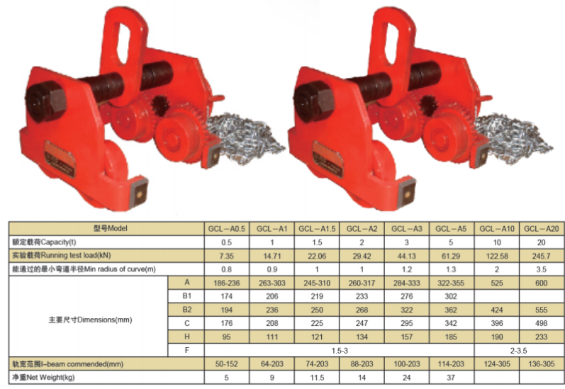 Thiết kế nhỏ gọn, dễ sử dụng: Với trọng lượng chỉ 9kg, con chạy kéo tay GCL-A1 dễ dàng di chuyển và lắp đặt trên các loại dầm thép có kích thước từ 64-203mm.