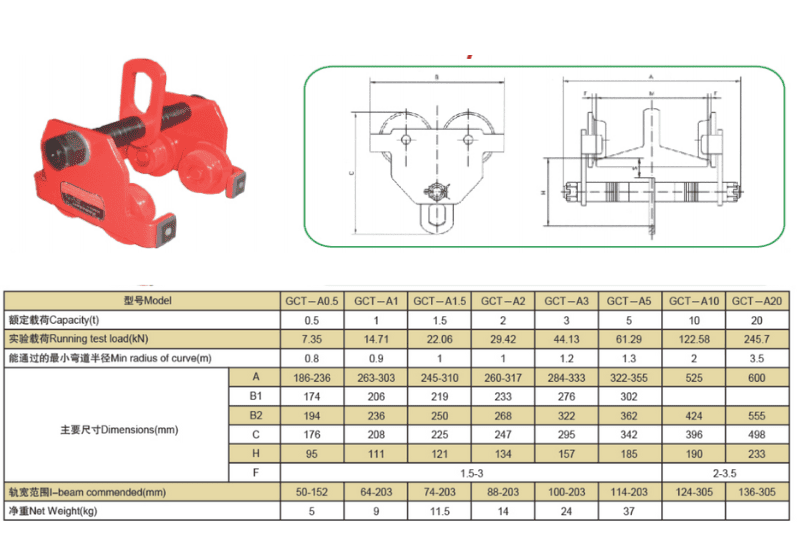 Khả năng chịu tải cao: Với tải trọng lên đến 5 tấn, con chạy kéo tay GCT-A5 đáp ứng tốt các nhu cầu nâng hạ trong các công trình xây dựng, nhà máy sản xuất, bến cảng, và các ngành công nghiệp nặng khác.