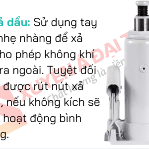 Nút xả dầu có chức năng xả bớt dầu thuỷ lực ra khỏi xi lanh khi cần thiết, giúp điều chỉnh độ cao và áp xuất của kích dễ dàng. Việc xả dầu được thực hiện bằng các xoay nhẹ tay quay trên nút xả, giúp dễ dàng kiểm soát lượng dầu xả ra. Lưu ý, không nên rút nút xả ra vì điều này sẽ khiến dầu chảy hết ra ngoài và khiến kích không thể hoạt động. Điều này có thể làm hỏng kích thuỷ lực và gây nguy hiểm cho người sử dụng