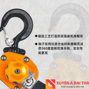 - Móc cẩu có khóa an toàn chắc chắn, có thể xoay 360 độ: Móc cẩu được thiết kế với một khóa an toàn để đảm bảo tải không bị tuột ra. Đồng thời, móc cẩu có thể xoay tròn 360 độ, giúp người dùng dễ dàng điều chỉnh vị trí của móc.