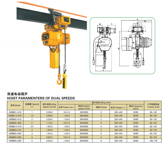 Thông Số Kỹ Thuật Palang Xích Điện 2000KG – Model KKBB02-01D – 2 Tốc Độ – Kawasaki