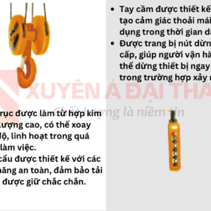 - Tính an toàn: Móc cẩu được thiết kế chắc chắn, tay cầm điều khiển có nút dừng khẩn cấp, đảm bảo an toàn cho người vận hành và tải trọng.